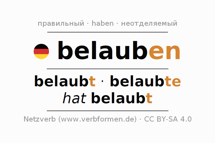 - Презенс: belaub(e) (du), belauben wir, belaubt (ihr), belauben Sie