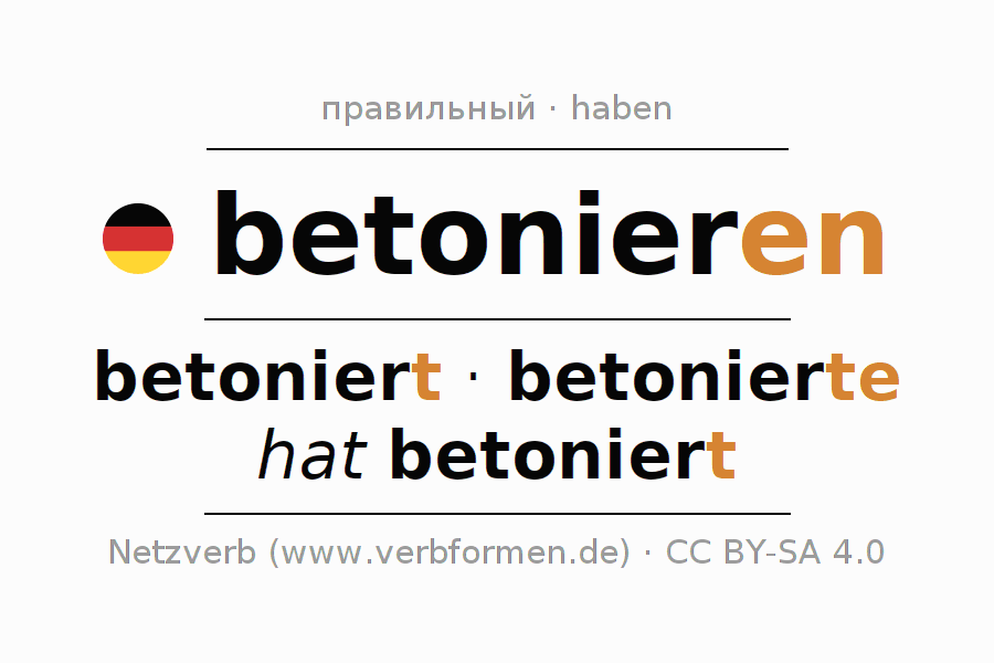 - Перфект: ich habe betoniert, du hast betoniert, er hat betoniert, wir haben betoniert, ihr habt betoniert, sie haben betoniert