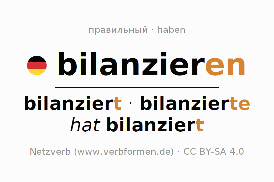 - Презенс: bilanzier(e) (du), bilanzieren wir, bilanziert (ihr), bilanzieren Sie