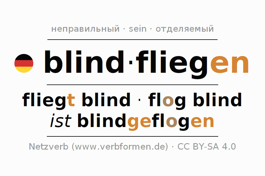 - Презенс: flieg(e) (du) blind, fliegen wir blind, fliegt (ihr) blind, fliegen Sie blind