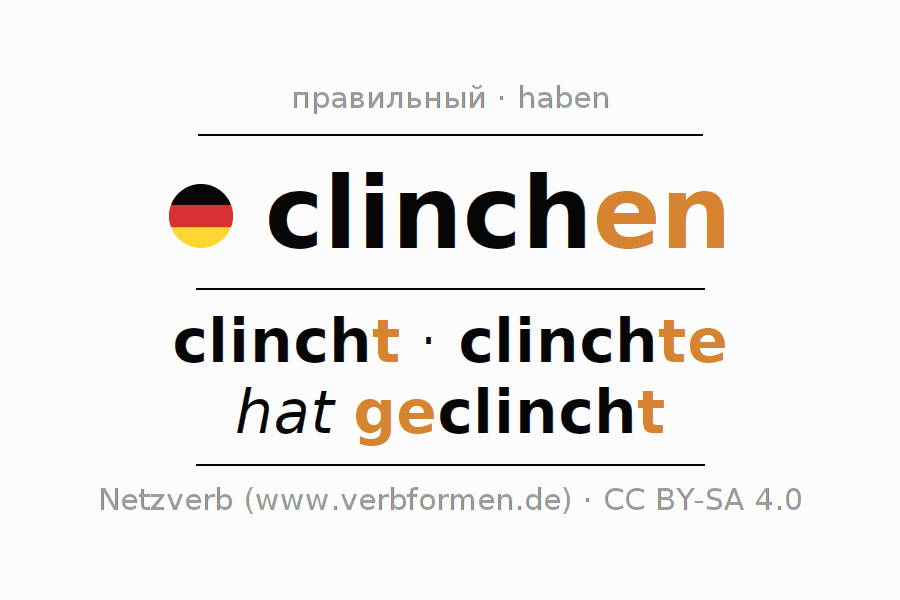 - Презенс: clinch(e) (du), clinchen wir, clincht (ihr), clinchen Sie