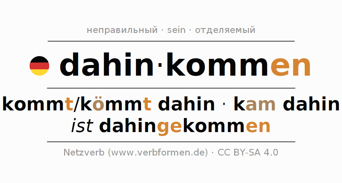 - Презенс: komm(e) (du) dahin, kommen wir dahin, kommt (ihr) dahin, kommen Sie dahin