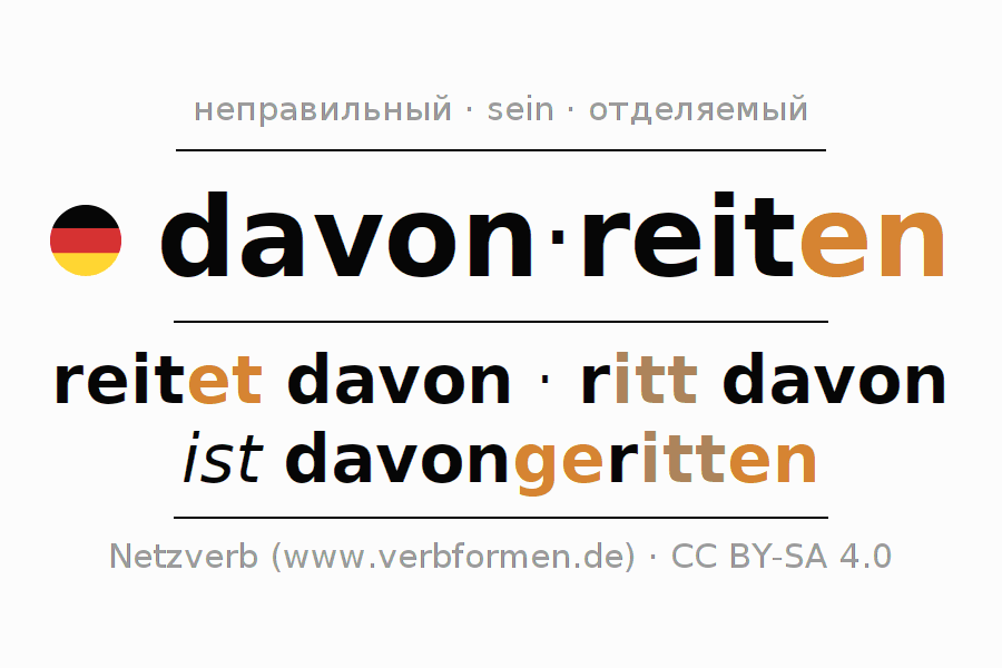 - Презенс: ich reit(e) davon, du reitest davon, er reitet davon, wir reiten davon, ihr reitet davon, sie reiten davon