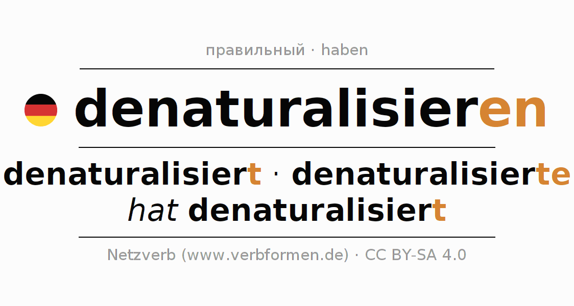 - Перфект: ich habe denaturalisiert, du habest denaturalisiert, er habe denaturalisiert, wir haben denaturalisiert, ihr habet denaturalisiert, sie haben denaturalisiert