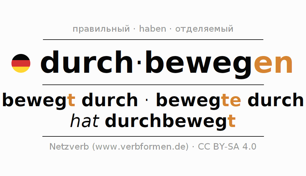 - Презенс: beweg(e) (du) durch, bewegen wir durch, bewegt (ihr) durch, bewegen Sie durch