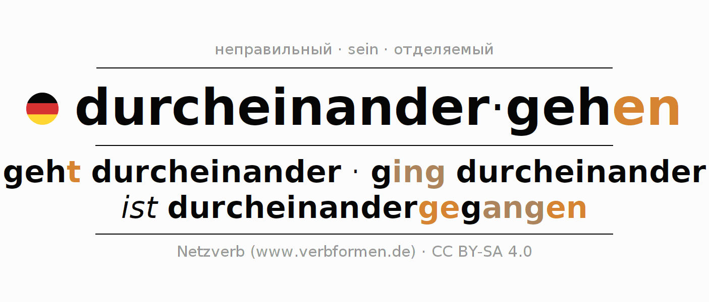 Все временные формы глагола и отглагольных форм durcheinandergehen