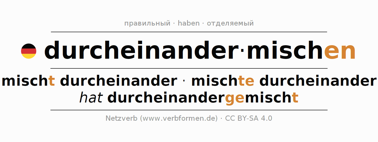 - Презенс: misch(e) (du) durcheinander, mischen wir durcheinander, mischt (ihr) durcheinander, mischen Sie durcheinander