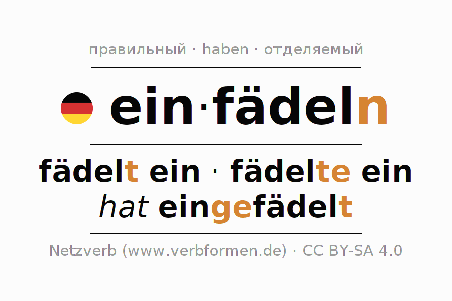- Презенс: fäd(e)l(e) (du) ein, fädeln wir ein, fädelt (ihr) ein, fädeln Sie ein