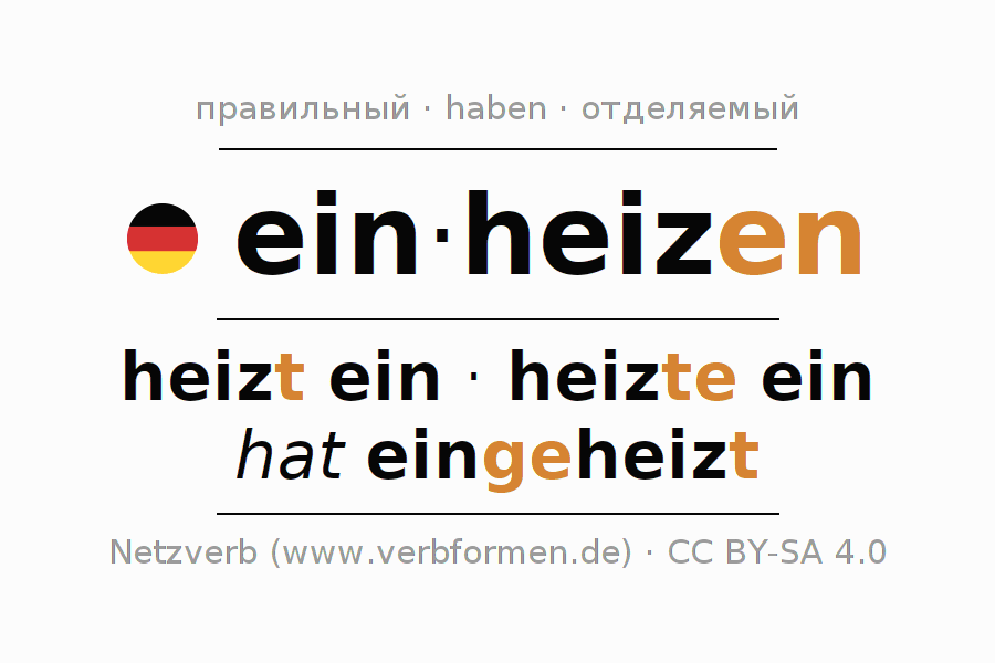 - Презенс: heiz(e) (du) ein, heizen wir ein, heizt (ihr) ein, heizen Sie ein