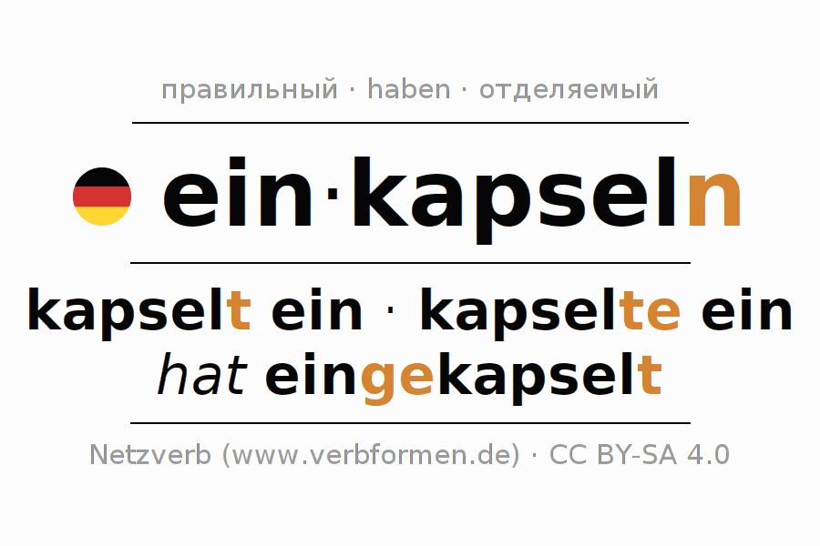 - Презенс: ich kaps(e)le ein, du kapselst ein, er kaps(e)le ein, wir kapseln ein, ihr kapselt ein, sie kapseln ein