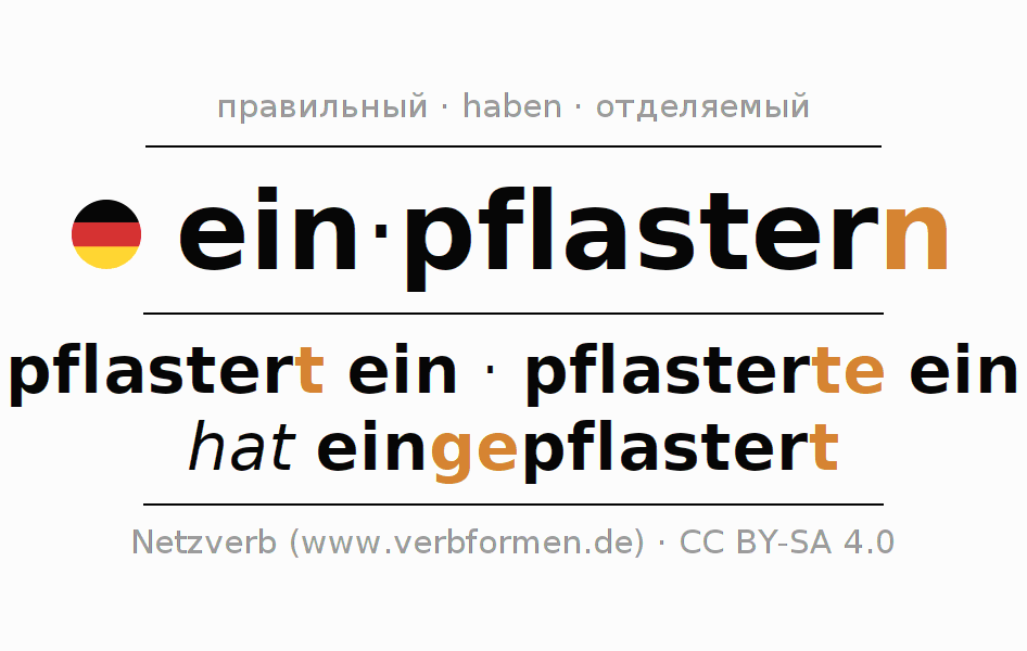 - Презенс: pflast(e)r(e) (du) ein, pflastern wir ein, pflastert (ihr) ein, pflastern Sie ein