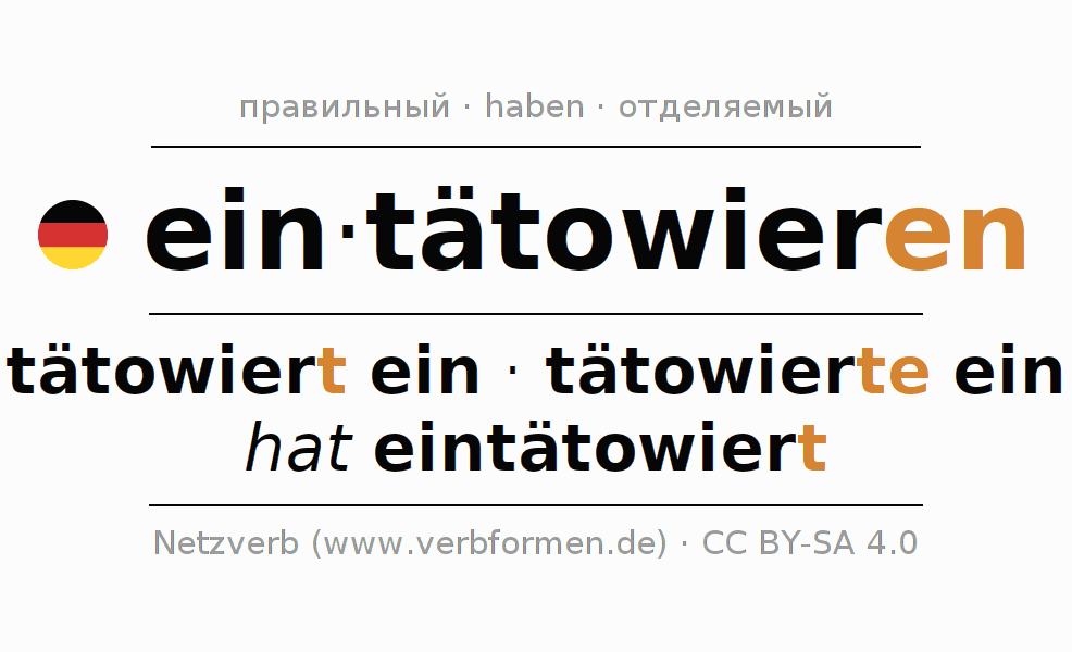 - Презенс: tätowier(e) (du) ein, tätowieren wir ein, tätowiert (ihr) ein, tätowieren Sie ein