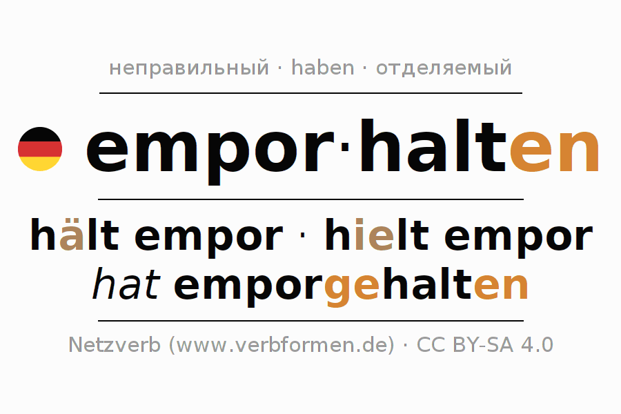 - Презенс: halt(e) (du) empor, halten wir empor, haltet (ihr) empor, halten Sie empor