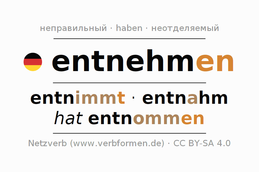 - Презенс: entnimm (du), entnehmen wir, entnehmt (ihr), entnehmen Sie