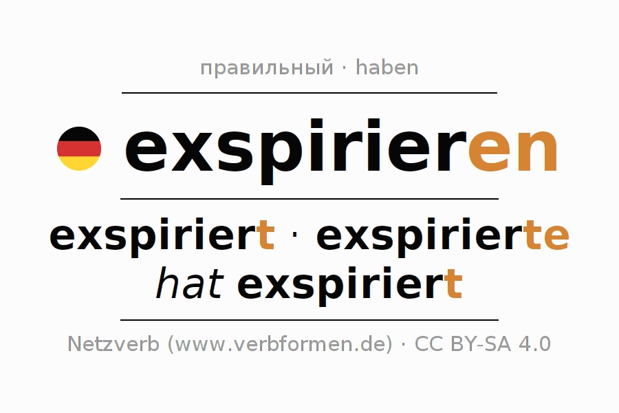 - Футурум I: ich werde exspirieren, du wirst exspirieren, er wird exspirieren, wir werden exspirieren, ihr werdet exspirieren, sie werden exspirieren