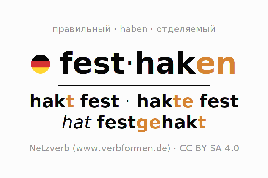 - Презенс: hak(e) (du) fest, haken wir fest, hakt (ihr) fest, haken Sie fest