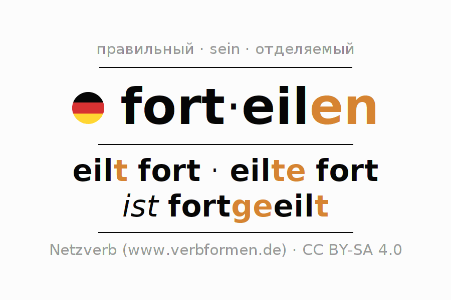 - Презенс: ich eile fort, du eilest fort, er eile fort, wir eilen fort, ihr eilet fort, sie eilen fort