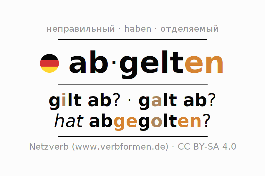 - Презенс: gelt(e)/gilt (du) ab, gelten wir ab, geltet (ihr) ab, gelten Sie ab