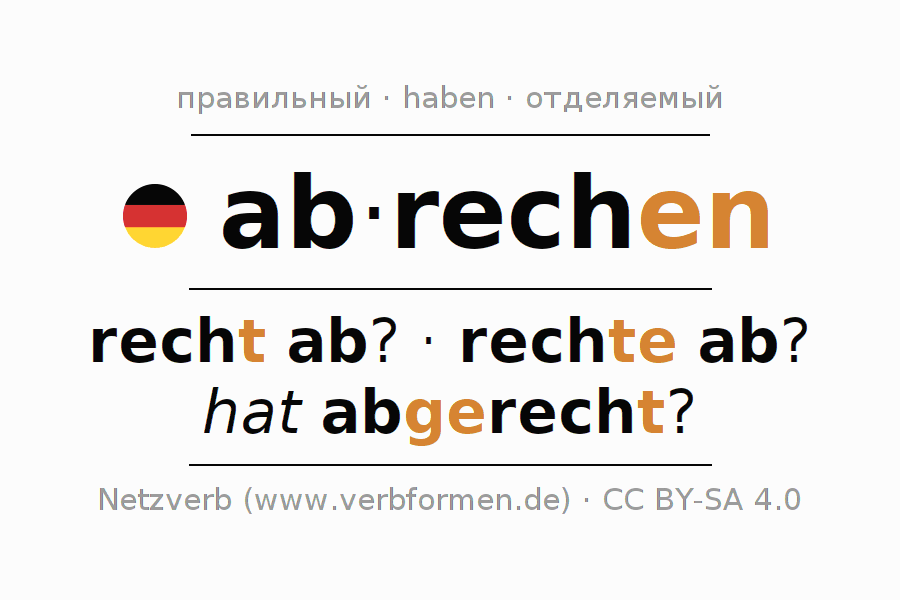 - Презенс: rech(e) (du) ab, rechen wir ab, recht (ihr) ab, rechen Sie ab