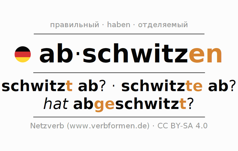- Презенс: schwitz(e) (du) ab, schwitzen wir ab, schwitzt (ihr) ab, schwitzen Sie ab