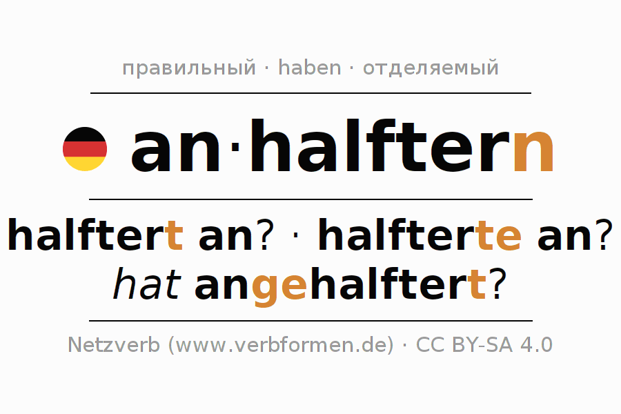 - Презенс: halft(e)r(e) (du) an, halftern wir an, halftert (ihr) an, halftern Sie an