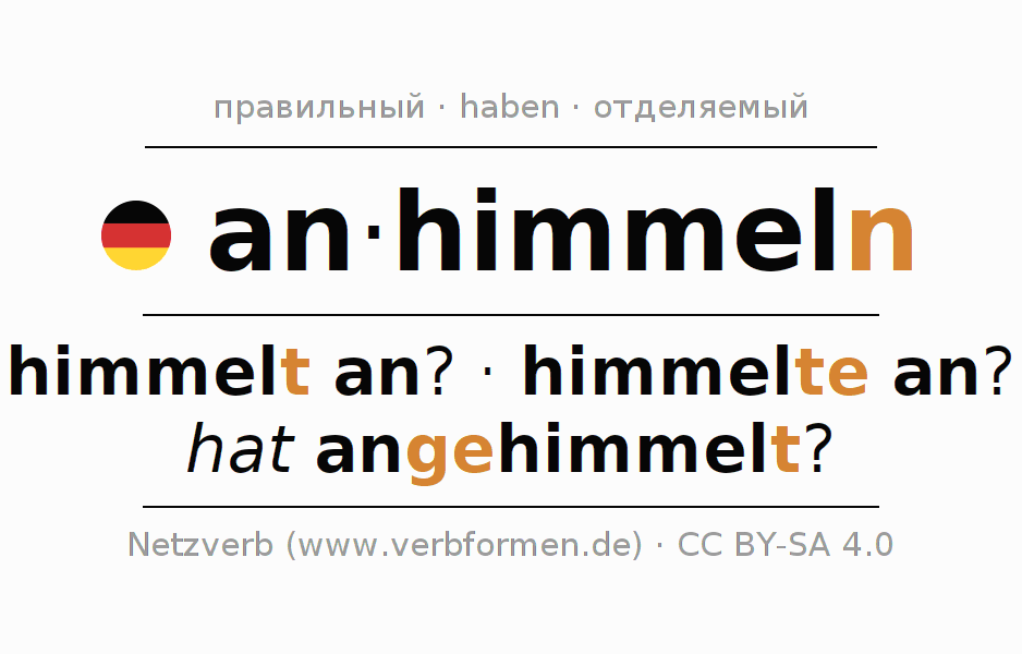 - Презенс: himm(e)l(e) ich an?, himmelst du an?, himmelt er an?, himmeln wir an?, himmelt ihr an?, himmeln sie an?