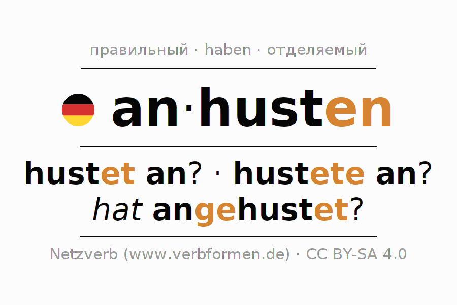- Презенс: hust(e) (du) an, husten wir an, hustet (ihr) an, husten Sie an