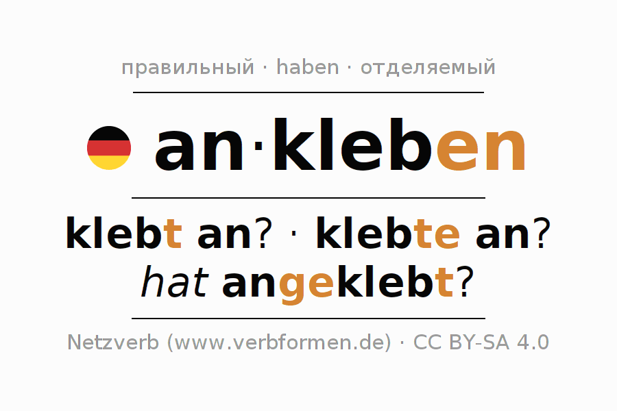 - Презенс: kleb(e) (du) an, kleben wir an, klebt (ihr) an, kleben Sie an