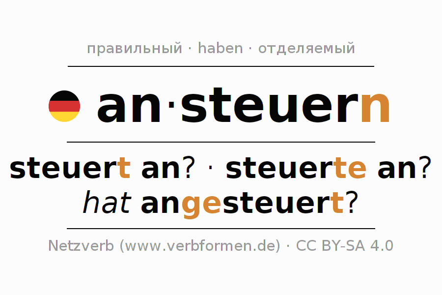 - Презенс: steu(e)r(e) ich an?, steuerst du an?, steuert er an?, steuern wir an?, steuert ihr an?, steuern sie an?