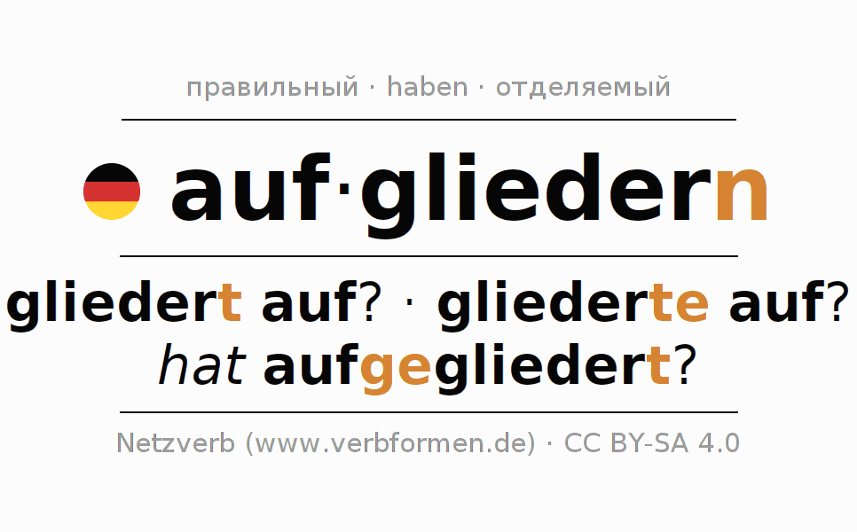 - Презенс: glied(e)r(e) (du) auf, gliedern wir auf, gliedert (ihr) auf, gliedern Sie auf