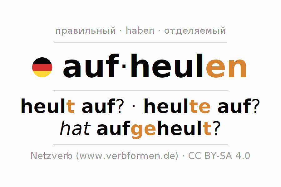 - Перфект: habe ich aufgeheult?, hast du aufgeheult?, hat er aufgeheult?, haben wir aufgeheult?, habt ihr aufgeheult?, haben sie aufgeheult?