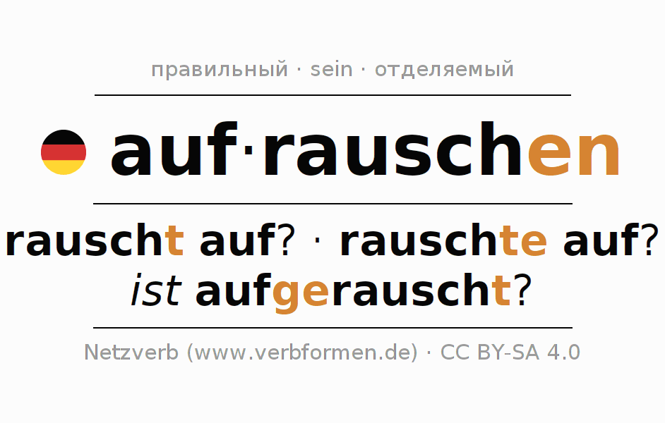 - Презенс: rausche ich auf?, rauschest du auf?, rausche er auf?, rauschen wir auf?, rauschet ihr auf?, rauschen sie auf?