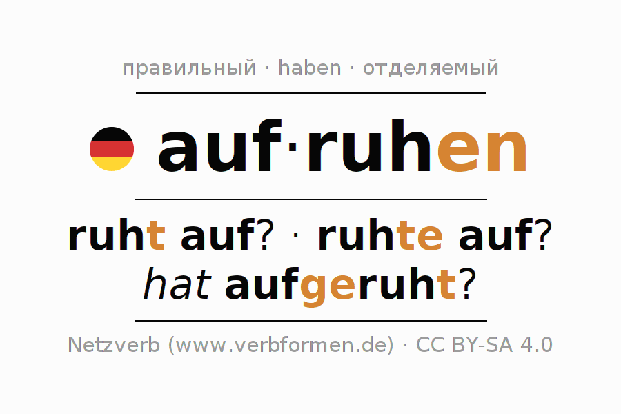 - Презенс: ruh(e) ich auf?, ruhst du auf?, ruht er auf?, ruh(e)n wir auf?, ruht ihr auf?, ruh(e)n sie auf?