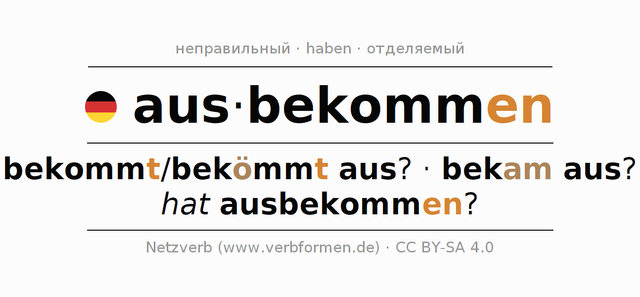 - Презенс: bekomm(e) (du) aus, bekommen wir aus, bekommt (ihr) aus, bekommen Sie aus
