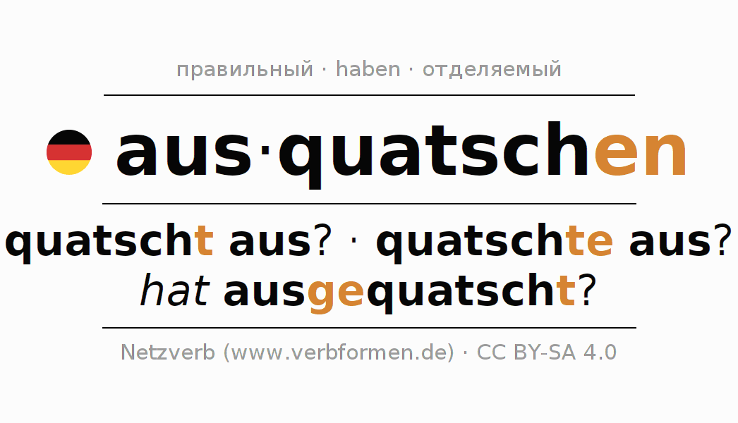 - Презенс: quatsche ich aus?, quatschest du aus?, quatsche er aus?, quatschen wir aus?, quatschet ihr aus?, quatschen sie aus?