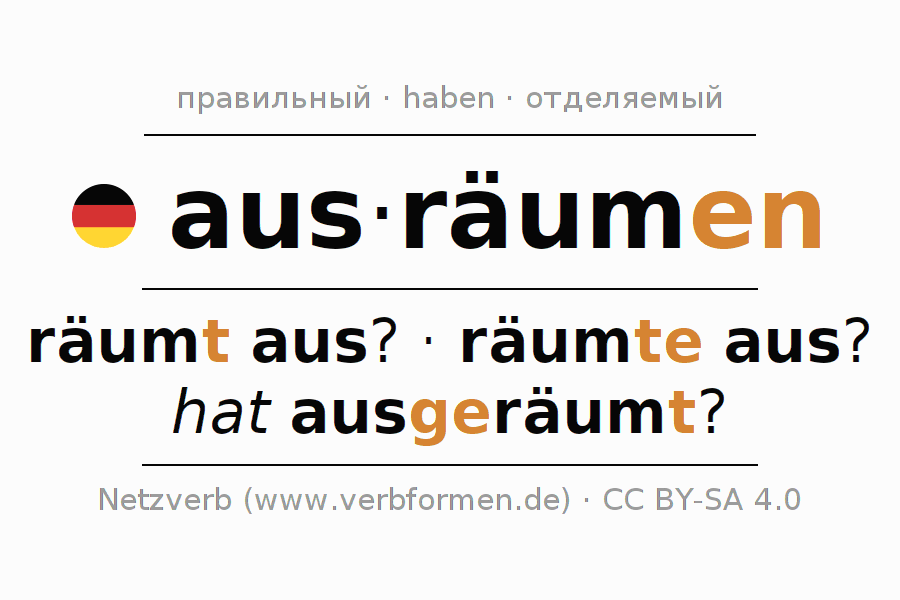 - Презенс: räum(e) (du) aus, räumen wir aus, räumt (ihr) aus, räumen Sie aus