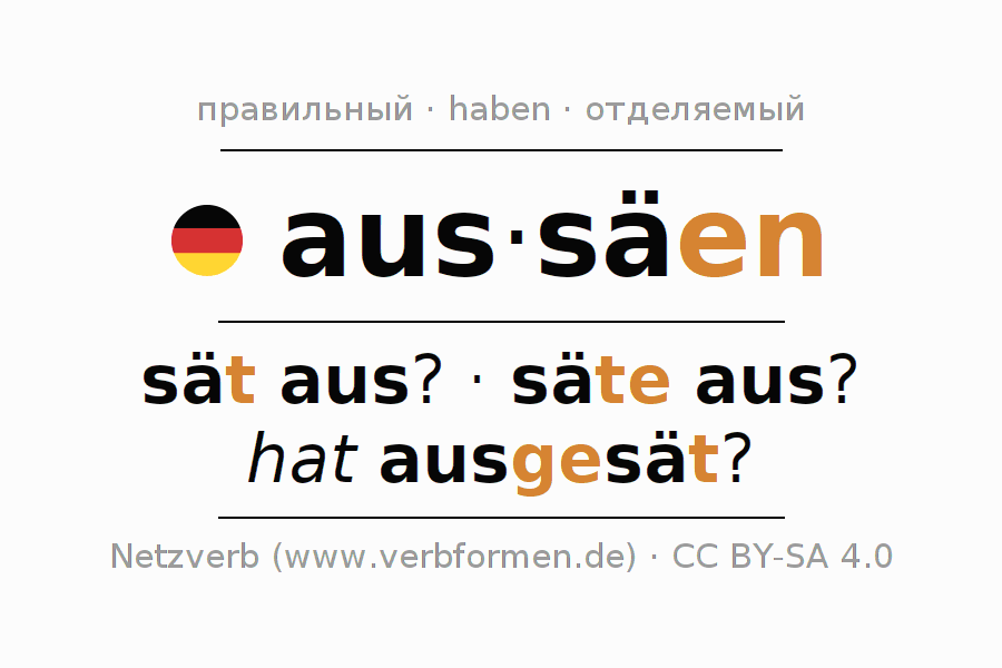 Глагол aussäen спрягается в индикативе Действительный залог (актив) в настоящем, прошедшем и будущем времени