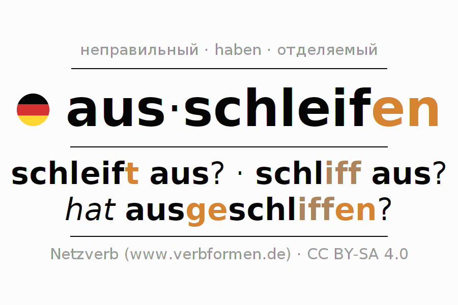 - Презенс: schleif(e) (du) aus, schleifen wir aus, schleift (ihr) aus, schleifen Sie aus