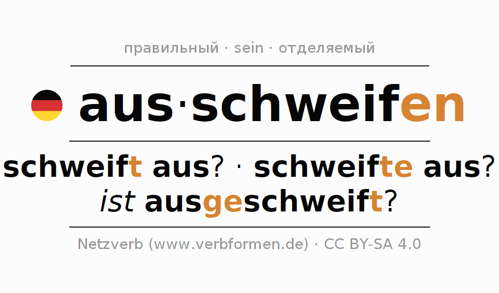 Глагол ausschweifen (ist) спрягается в индикативе Действительный залог (актив) в настоящем, прошедшем и будущем времени