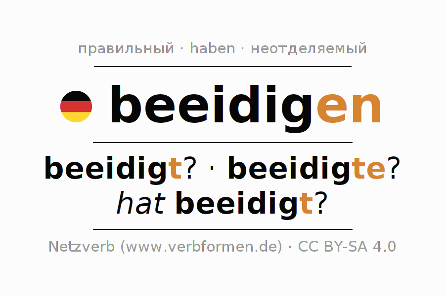 - Презенс: beeidige (du), beeidigen wir, beeidigt (ihr), beeidigen Sie