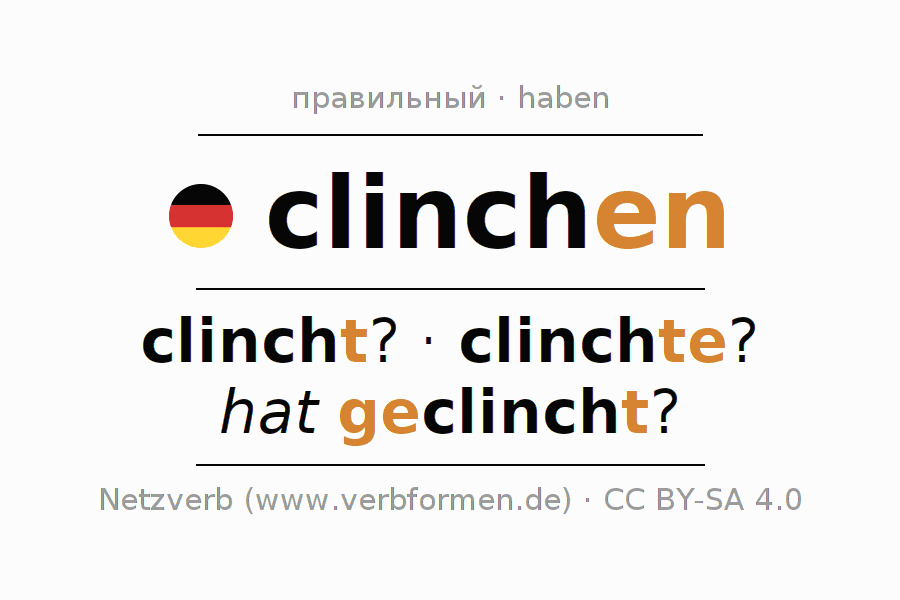 - Презенс: clinch(e) (du), clinchen wir, clincht (ihr), clinchen Sie