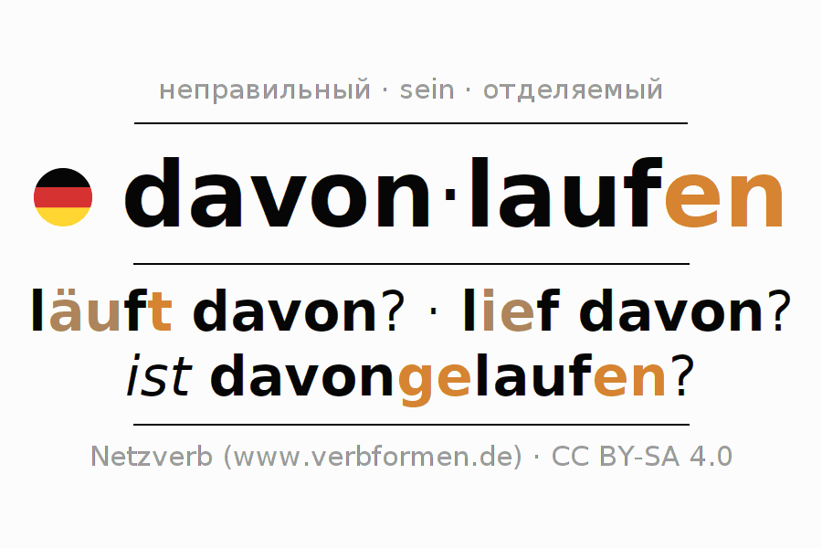 - Презенс: lauf(e) (du) davon, laufen wir davon, lauft (ihr) davon, laufen Sie davon