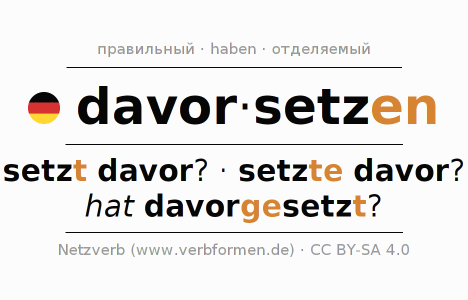- Презенс: setz(e) (du) davor, setzen wir davor, setzt (ihr) davor, setzen Sie davor