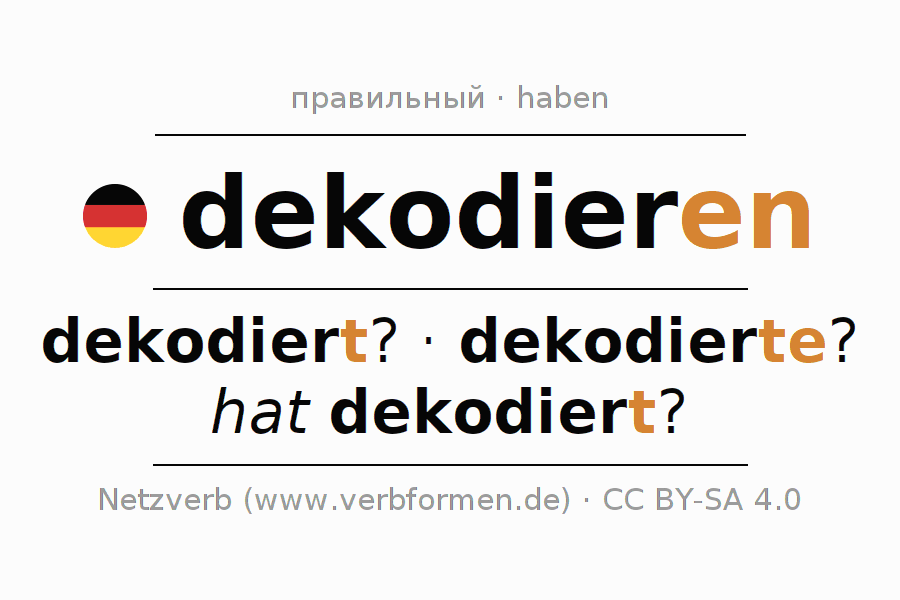 - Презенс: dekodier(e) ich?, dekodierst du?, dekodiert er?, dekodieren wir?, dekodiert ihr?, dekodieren sie?