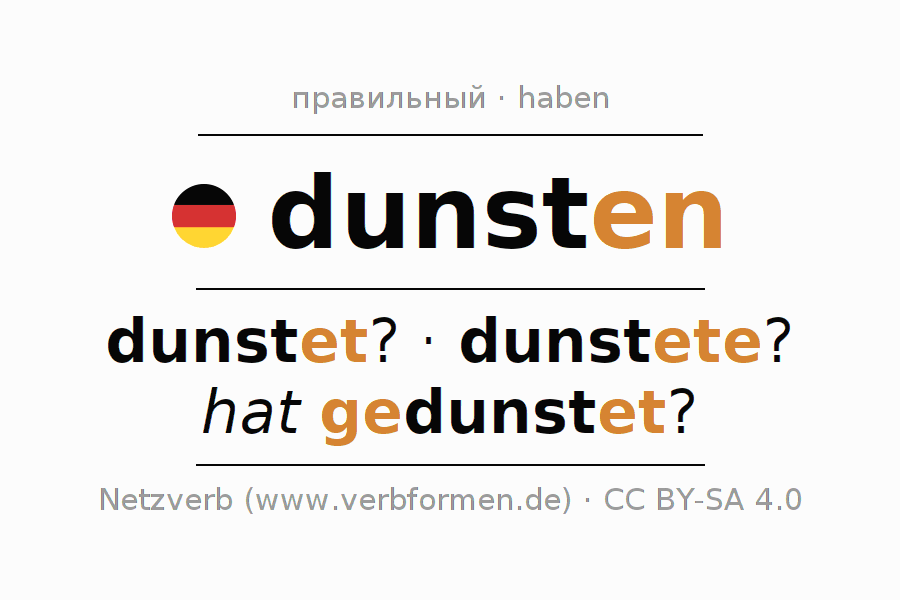 - Презенс: dunst(e) (du), dunsten wir, dunstet (ihr), dunsten Sie