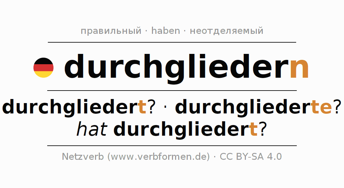 Спряжение глагола durchgliedern (разделять, структурировать) правильное. Формы глагола durchgliedert?, durchgliederte?, hat durchgliedert?. В качестве вспомогательного глагола к durchgliedern употребляется "haben". Приставка durch- для durchgliedern неотделяемая. Может быть и отделяемой. Склоняется в Действительный залог (актив) и употребляется в Вопросительное предложение. Для лучшего понимания приводится большое количество примеров употребления глагола durchgliedern. Для тренировки и закрепления навыков имеются также бесплатные рабочие листы по durchgliedern. Можно не только durchgliedern спрягать, но и все немецкие глаголы. Kомментарии ☆