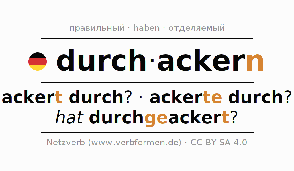 - Презенс: ack(e)r(e) (du) durch, ackern wir durch, ackert (ihr) durch, ackern Sie durch