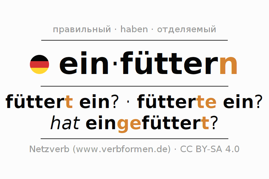 - Презенс: fütt(e)r(e) (du) ein, füttern wir ein, füttert (ihr) ein, füttern Sie ein