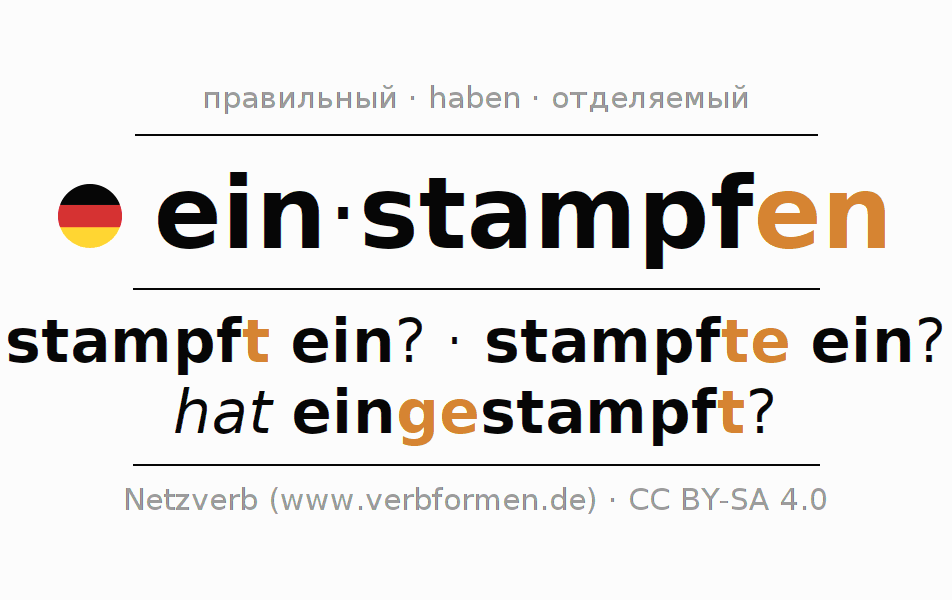 - Презенс: stampf(e) (du) ein, stampfen wir ein, stampft (ihr) ein, stampfen Sie ein