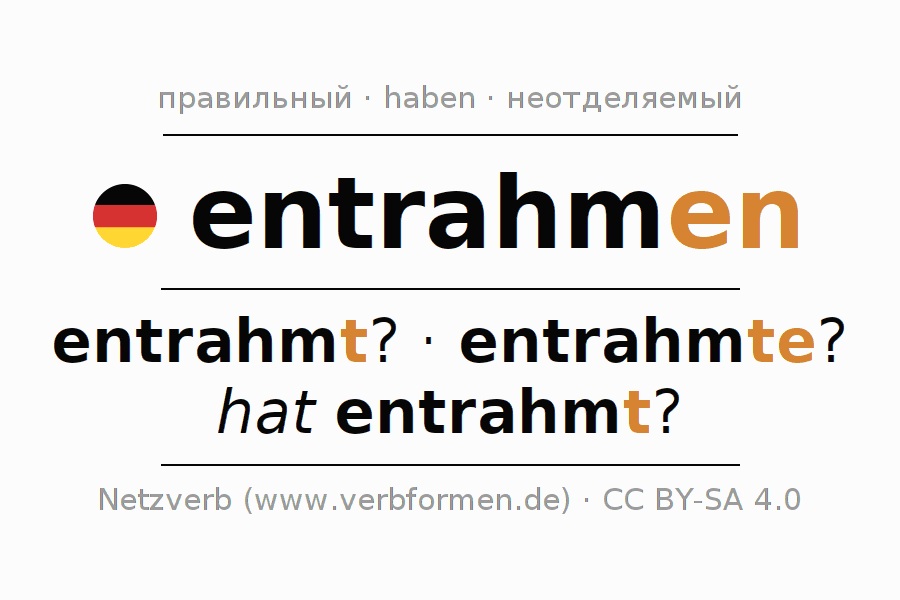 - Презенс: entrahm(e) ich?, entrahmst du?, entrahmt er?, entrahmen wir?, entrahmt ihr?, entrahmen sie?